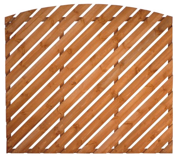 Arched Top Diagonal Palisade Panel. Manufactured using the finest English Spruce with diagonal pales mounted on substantial horizontal and vertical framing. The pales are fixed with 25mm (1″) gaps making it an ideal panel when a more open feel is required and the arched top design perfectly compliments the diagonal boarding.